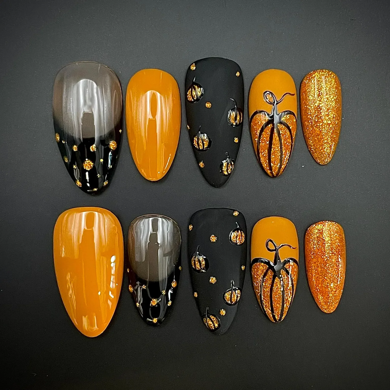 Pumpkin lovers, this set is for you. With warm orange tones and tiny pumpkin details, they’re perfect for harvest festivals, farmer’s market strolls, and Thanksgiving gatherings. They give your nails that cozy but playful feel we all want in autumn.